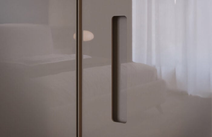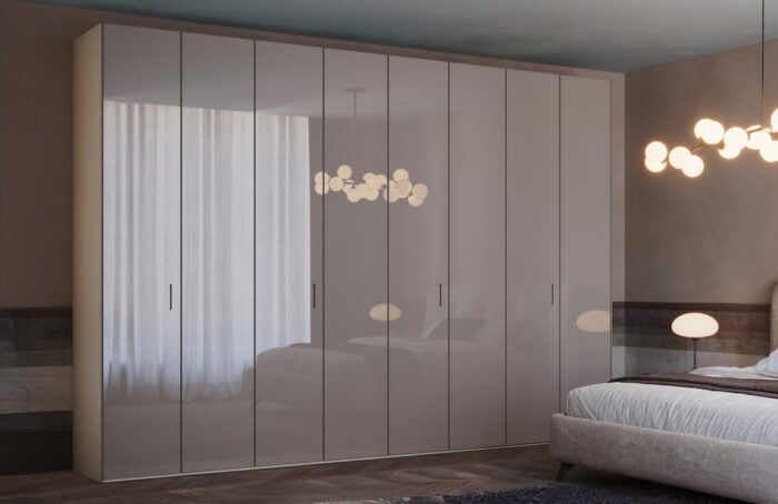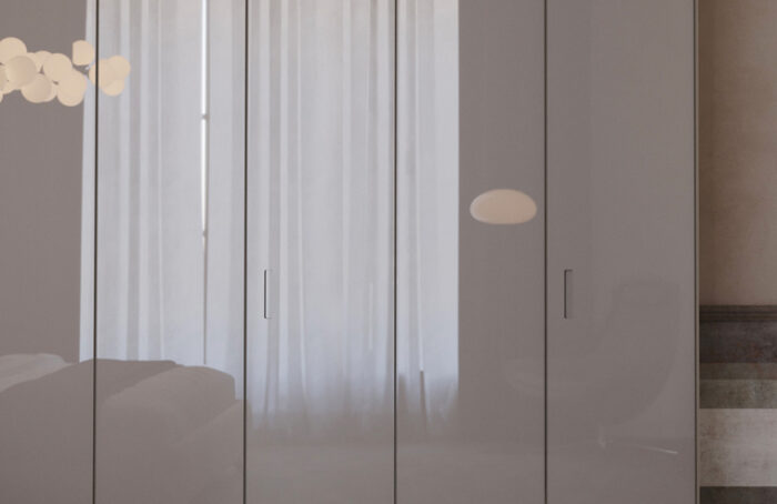 Finitura lucida e maniglie integrate: un design essenziale e riflettente che valorizza la luminosità dell’ambiente.