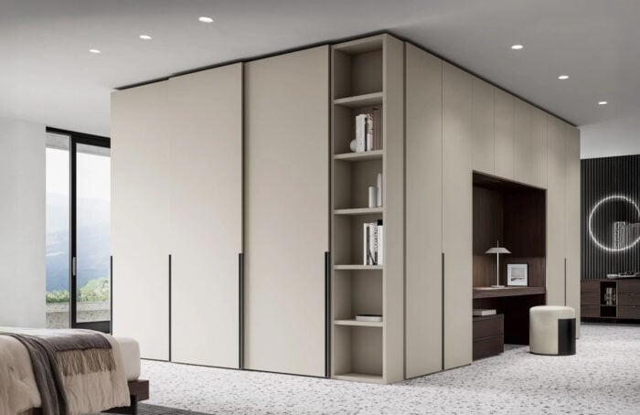 Armadio ad ante scorrevoli e battenti con libreria a giorno integrata. Il vano si adatta a diverse esigenze e può avere finiture coordinate o personalizzate su richiesta.