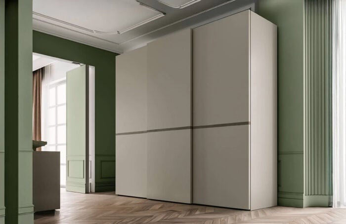 Armadio scorrevole con fascia orizzontale centrale personalizzabile. Le ante minimal valorizzano lo stile essenziale, mentre l’inserto crea un elegante dettaglio grafico.