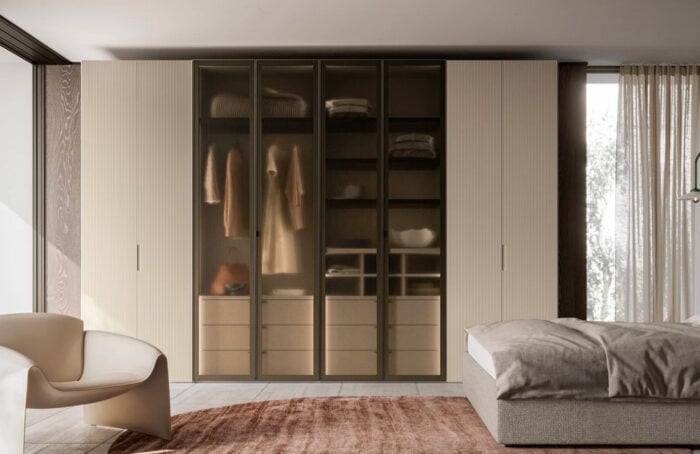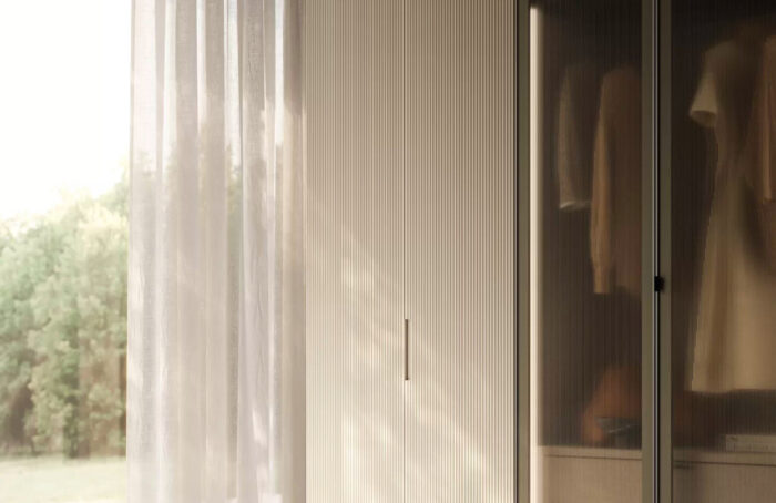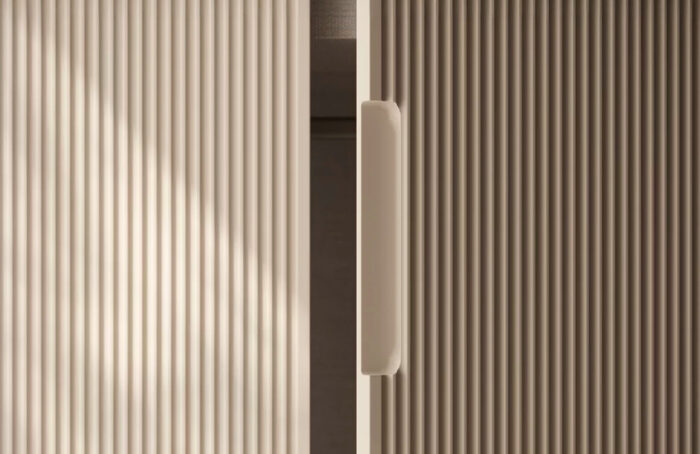Maniglia scavata in tinta, integrata nel design per un’estetica pulita e raffinata.