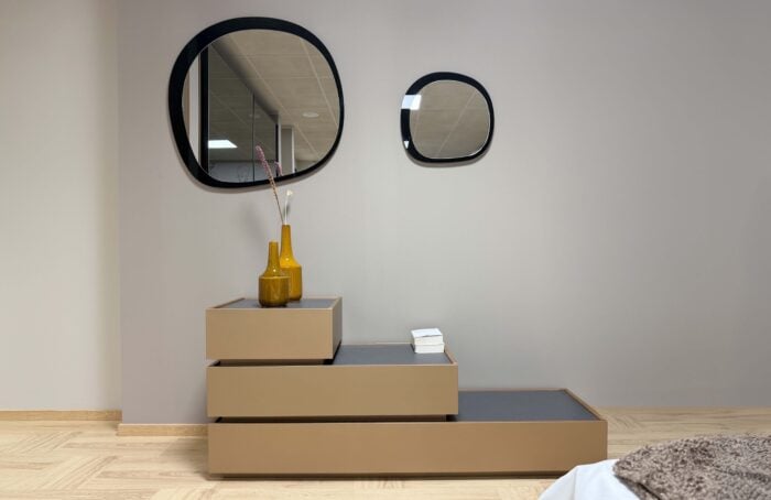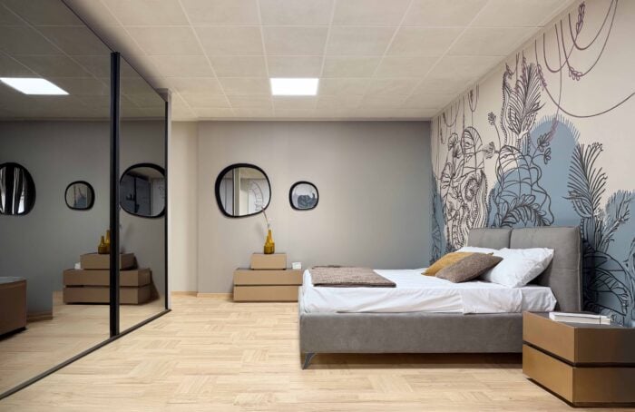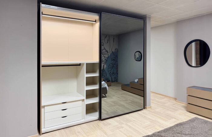 L’armadio con ante scorrevoli e pannelli in specchio fumé dona profondità all’ambiente ed è arricchito da pratici LED interni che si attivano automaticamente all’apertura. L’interno è accessoriato per garantire massima funzionalità.