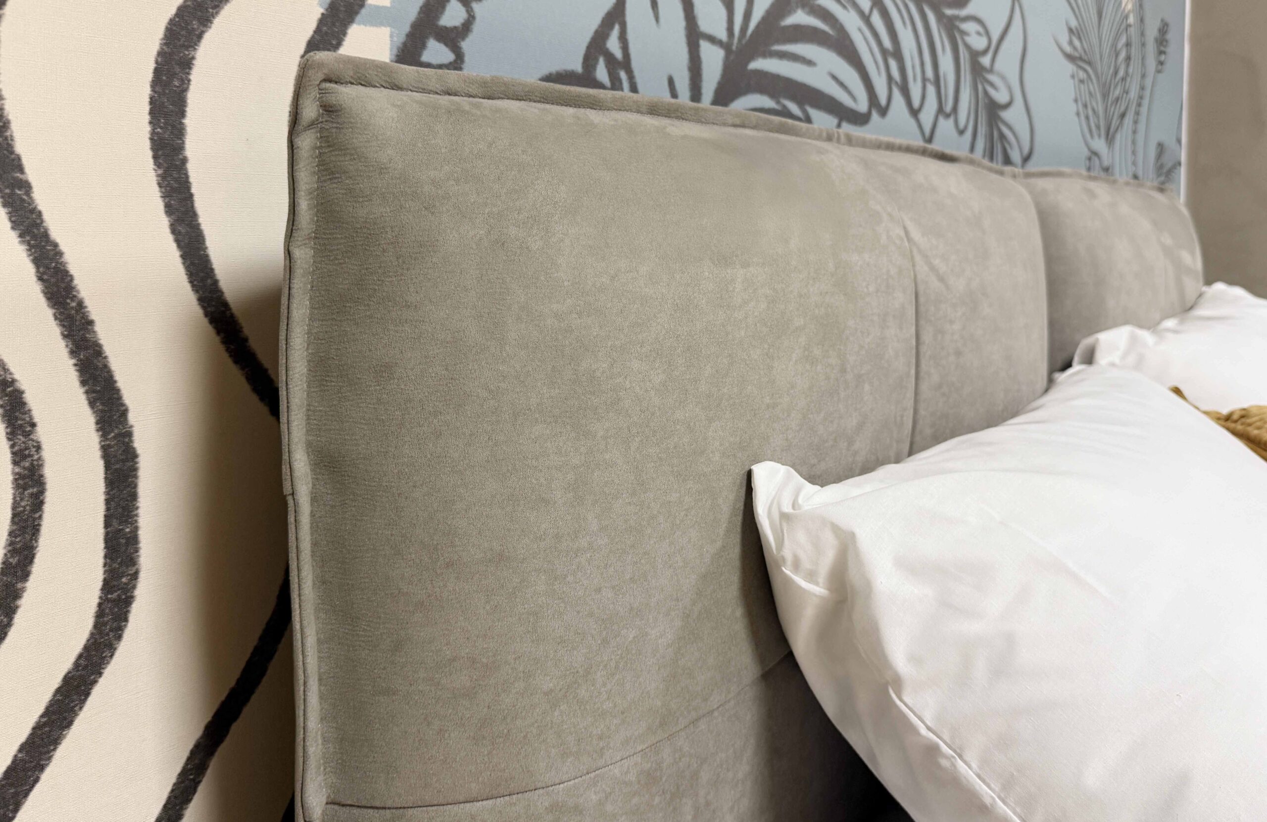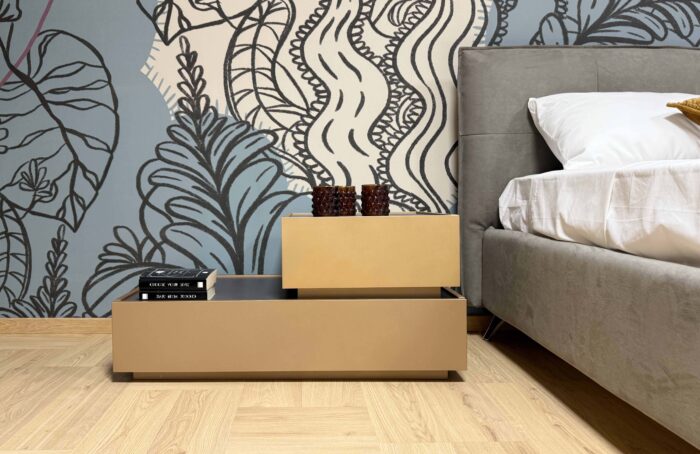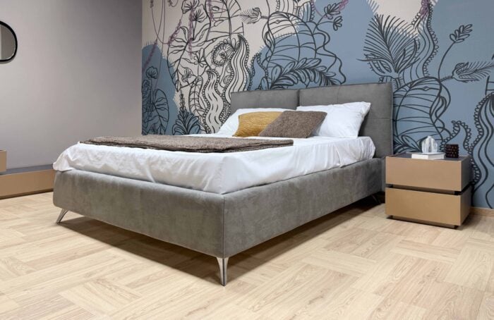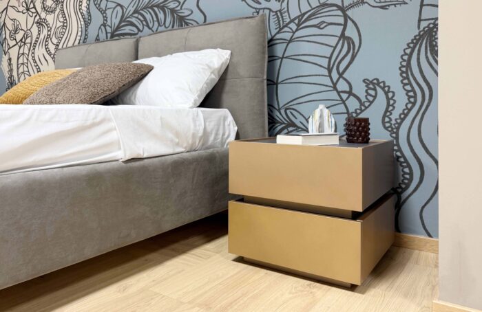 Camera matrimoniale completa. Composta da letto imbottito, due comodini e un comò a tre cassetti, tutti dotati di guide ammortizzate per un’apertura morbida.