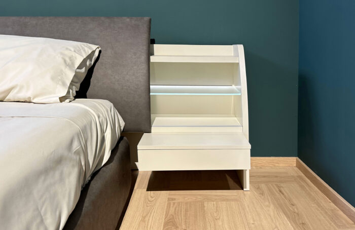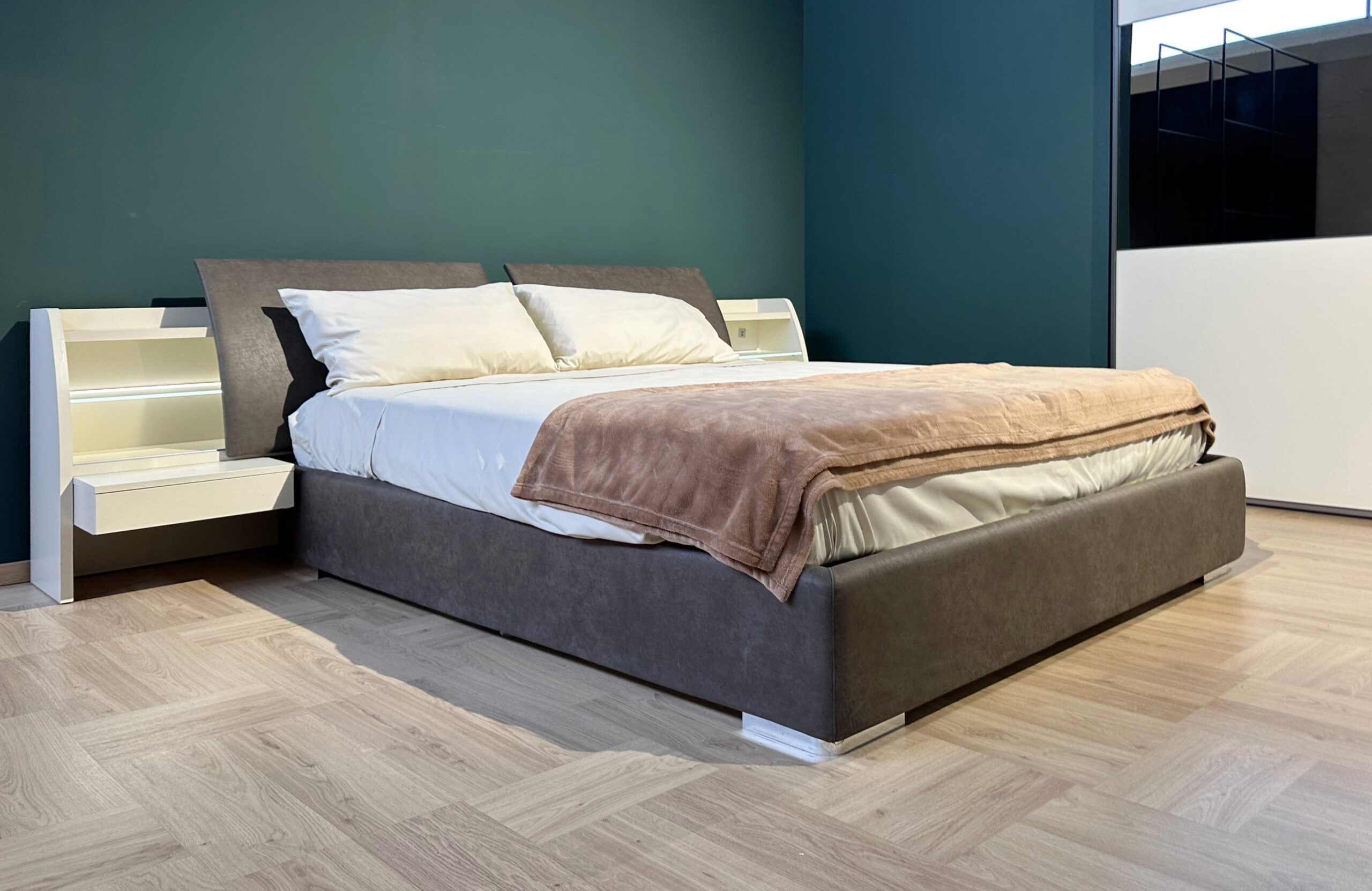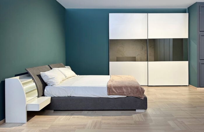 Camera matrimoniale moderna con letto imbottito contenitore con comodini annessi retro illuminati, armadio a due ante scorrevoli con inserti a specchio.