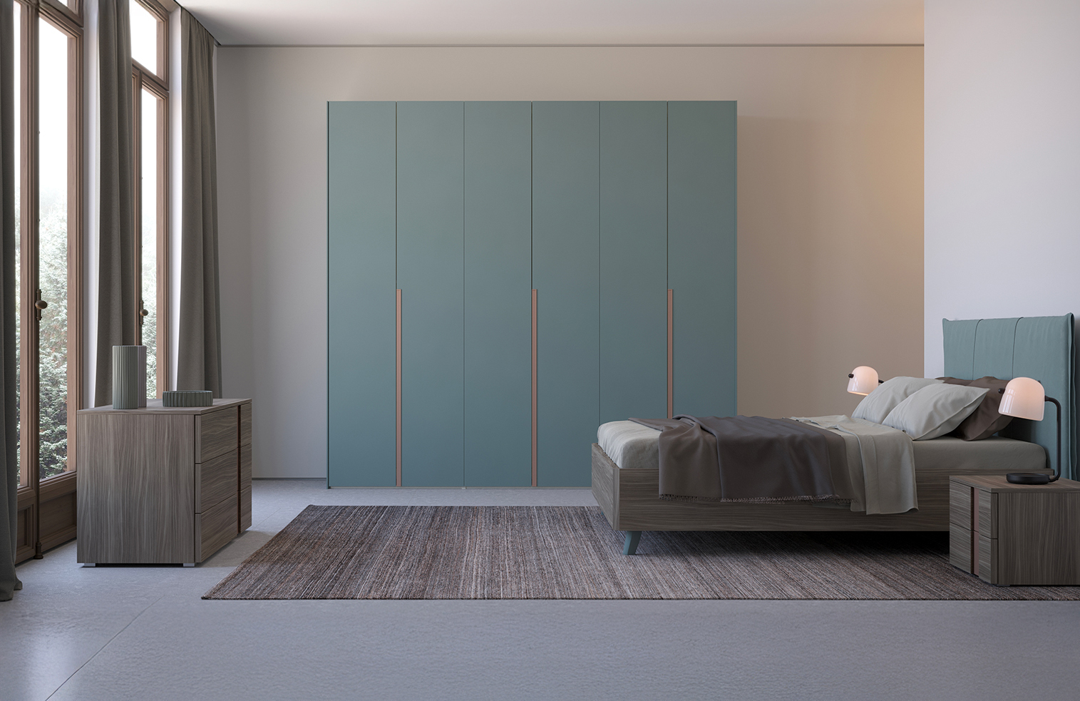 Camera matrimoniale moderna e accogliente, dal design elegante con un tocco di colore. Composta da letto contenitore (rete a doghe 160×190) con giroletto e piedini in legno, e testiera in tinta coordinata alle ante battenti dell’armadio in finitura azzurro opaco a contrasto con maniglie a gola champagne (L 277 x H 246 x P 61 cm), disponibile anche con altezza maggiorata H 262 cm. Completano la composizione il comò e due comodini abbinati in essenza legno, con dettagli verticali a contrasto che richiamano l’intera linea. Una soluzione raffinata per arredare con stile la zona notte.