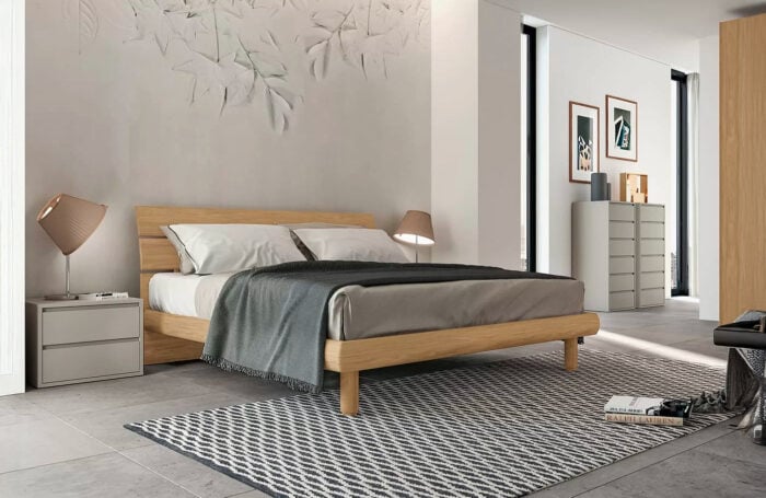 Letto matrimoniale in finitura effetto legno chiaro, con testiera inclinata a listelli orizzontali che dona leggerezza e stile. Struttura con piedini alti e giroletto stondato per un’estetica minimale e accogliente. Ideale per camere moderne dal gusto naturale e luminoso.