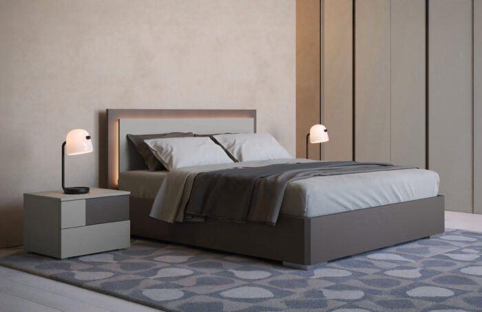 Letto matrimoniale contenitore made in Italy dal design minimale. Testiera con pannello retroilluminato e profilo a cornice, per un effetto luminoso elegante. Giroletto squadrato e compatto in finitura opaca.