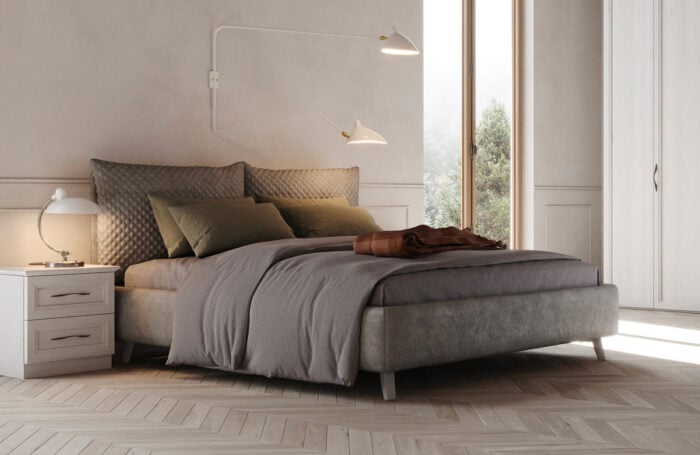 Letto matrimoniale imbottito con rivestimento anch’esso imbottito. Testiera trapuntata con 2 maxi cuscini e struttura sollevata da terra con piedini inclinati.