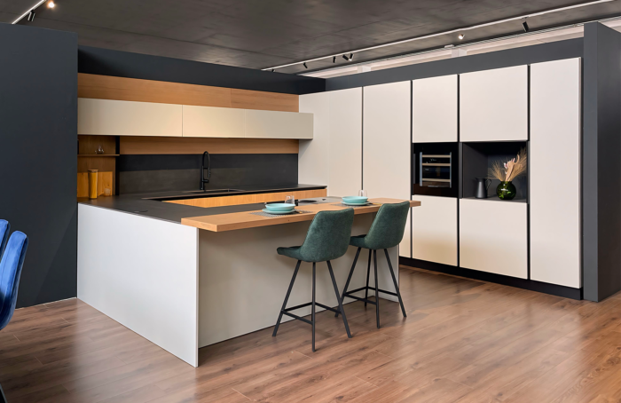 Frontali in laccato bianco opaco e top Iris in ceramica, dettagli in finitura Vintage rovere impiallacciato e maniglie a gola in Titanio.