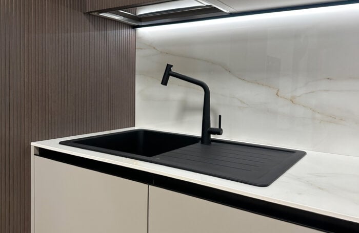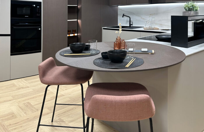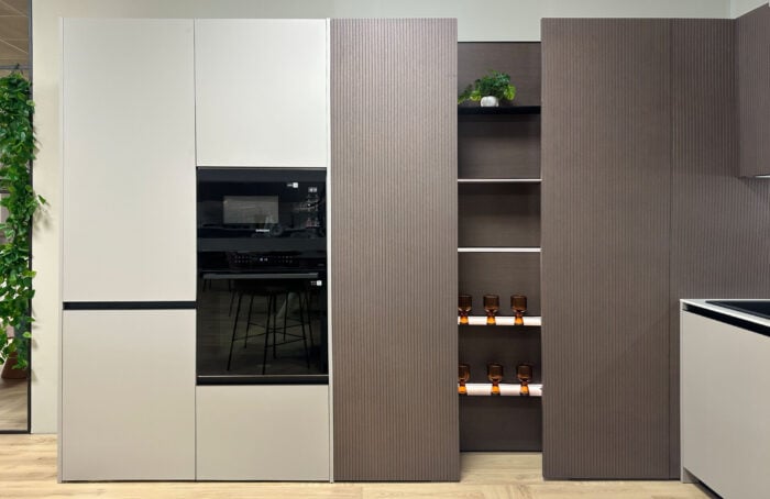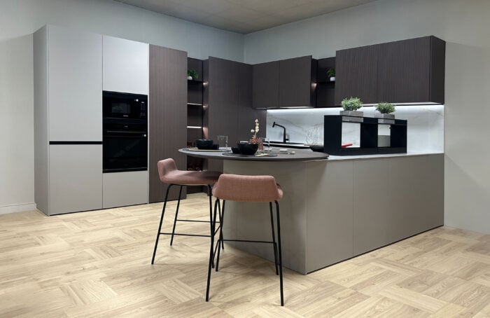La combinazione di ante chiare e canettato scuro crea un contrasto elegante e sofisticato. Top in abitum bianco marmorizzato dona luminosità all’ambiente, mentre i vani a giorno aggiungono funzionalità e stile. Completa di penisola snack tonda integrata per una zona pranzo accogliente e contemporanea.