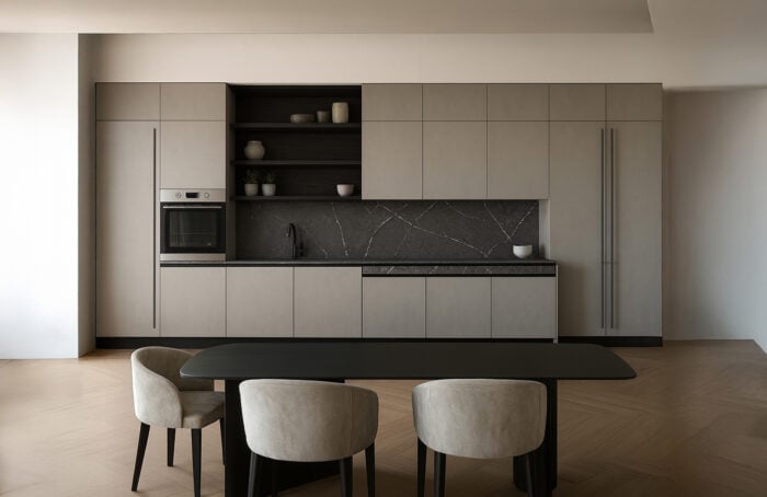Cucina lineare Arredo3, un’esclusiva disponibile solo nei nostri outlet, ideale per chi cerca stile e qualità a prezzo conveniente. Le ante in laccato opaco grigio chiaro si combinano con eleganti mensole in laminato effetto rovere fumé, mentre top, in due spessori, e schienale in HPL nero con venature bianche aggiungono un tocco moderno. Inclusi nel prezzo lavello nero con miscelatore coordinato e quattro elettrodomestici Hotpoint per una cucina completa e funzionale.