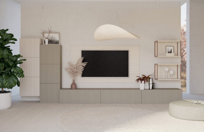 Parete attrezzata con base a terra composta da cassettoni, due colonne laterali e due mensole sospese sopra le basi, che incorniciano lo spazio contenitivo con schienale in rovere per il fissaggio della televisione. Una raffinata finitura bicolore, dai toni caldi e luminosi, arricchita da un elegante effetto cannettato.